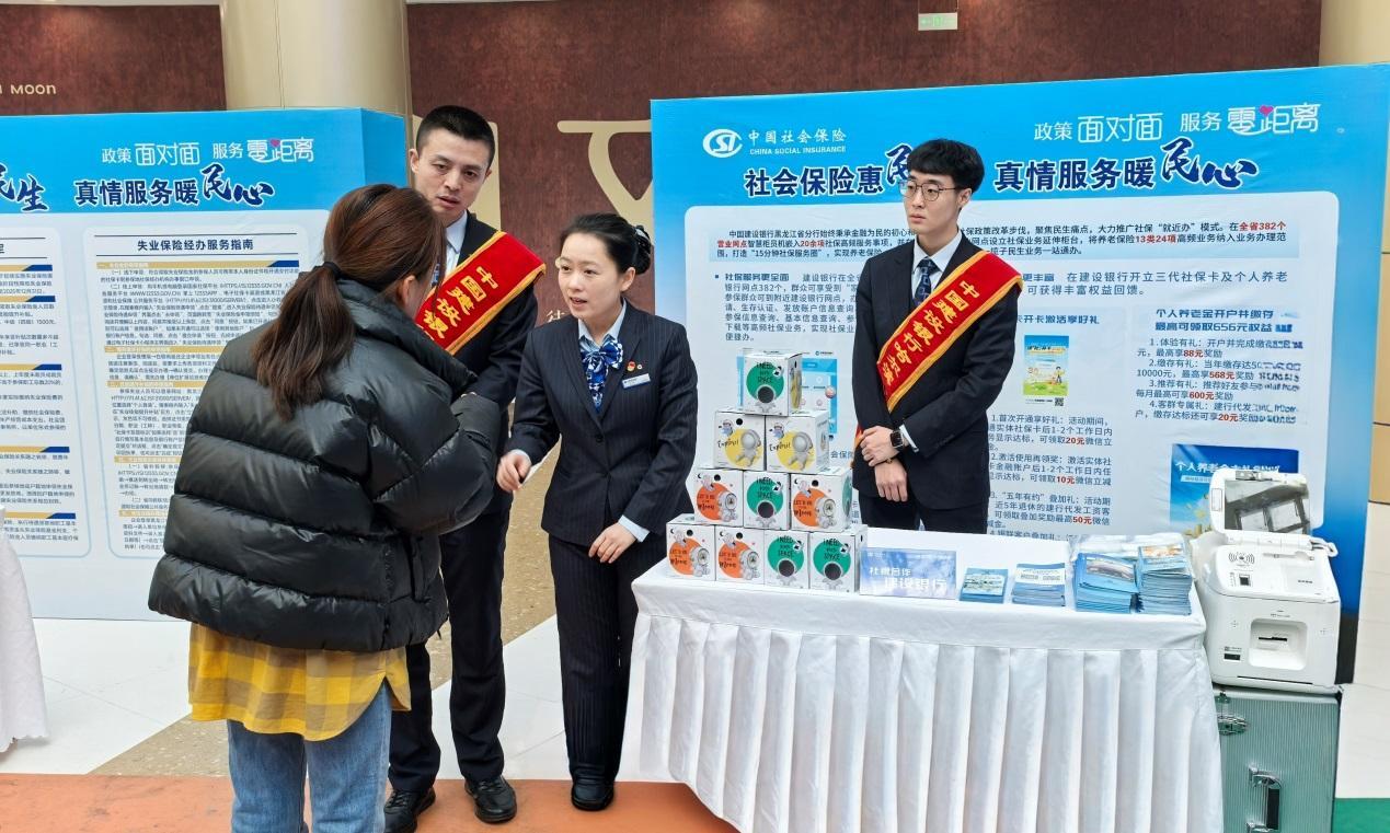 在活动现场,建设银行黑龙江省分行机构业务部、个人金融部和哈尔滨道里支行的工作人员共同组成“张富清金融服务队”,为市民讲解建设银行服务社保客群的政策、金融服务方式等内容,针对大家关心的第三代社保卡、个人养老金账户、退休待遇生存认证等核心业务进行“面对面”讲解。多位参保市民在建设银行黑龙江省分行服务专区亲身体验了社银“就近办”业务的便利。