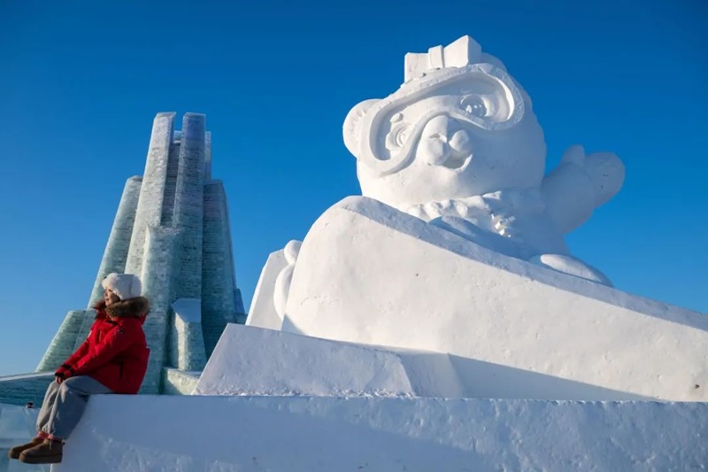 1月3日,在哈尔滨冰雪大世界园区,游客与亚冬会吉祥物雪雕“妮妮”合影。记者 张涛摄