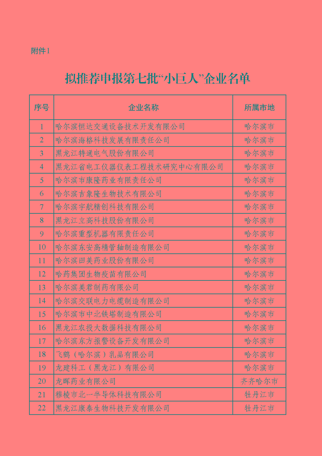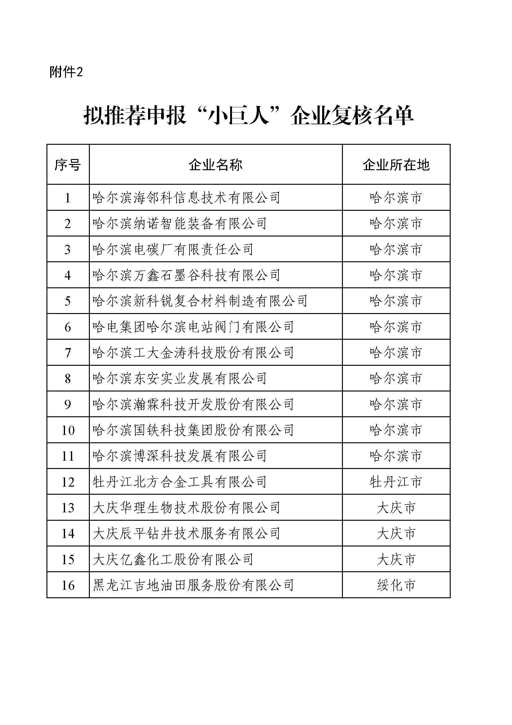按照《工业和信息化部办公厅关于开展2025年专精特新“小巨人”企业认定和复核工作的通知》(工信厅企业函〔2025〕190号)和《黑龙江省工业和信息化厅关于组织开展第七批“小巨人”企业申请和2022年认定和复核通过“小巨人”企业复核申请推荐工作的通知》(黑工信企业函〔2025〕330号)要求,依据《优质中小企业梯度培育管理暂行办法》(工信部企业〔2022〕63号)有关规定,省工信厅组织开展了第七批“小巨人”企业申请和2022年认定和复核通过“小巨人”企业复核申请推荐工作。经企业自愿申报、市(地)推荐、第三方机构审核、信用信息核查等程序,拟推荐哈尔滨恒达交通设备技术开发有限公司等39户企业申报第七批“小巨人”企业,拟推荐哈尔滨海邻科信息技术有限公司等16户企业申报“小巨人”企业复核,现予以公示,公示期为2025年6月11日—6月17日(5个工作日)。如有质疑或意见,请在公示期内据实反映。